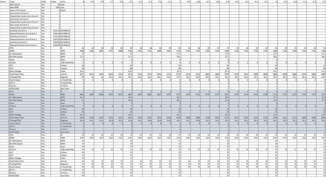 Currently only three EDR events can be stored in the motorcycle's Engine Control Unit (ECU). Once three events are recorded, no other events can be recorded. The EDR events are triggered when the motorcycle falls and goes into Emergency Shutdown (ES). In addition to the shutdown, the rear wheel would've had to been in motion within the ~10 seconds prior to shutdown. Some motorcycles take it a step further and require a deceleration of the rear wheel to trigger an event (i.e. from a hard brake). Once the bike shuts down, eight seconds of data is stored prior to the shutdown. Some of the main data parameters in a typical download include: engine RPM, throttle position, rear wheel speed, front wheel speed (if equipped), clutch position, gear position, grip position (if equipped), and more.