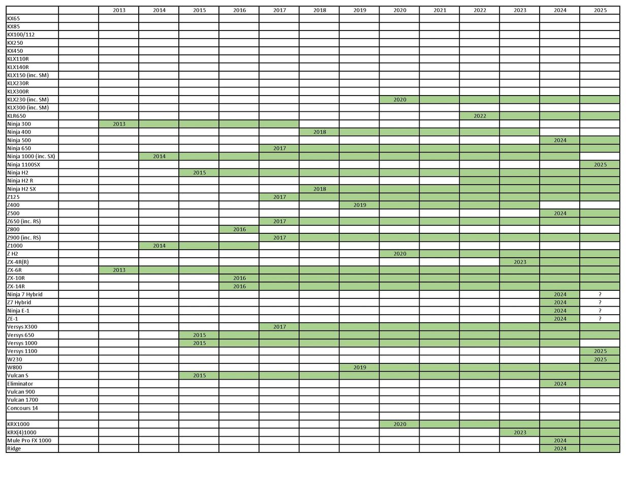 Kawasaki EDR (Event Data Recorder) or "Black Box" data has been implemented in Kawasaki motorcycles starting in 2013 with the Ninja 300 and the ZX-6R. Since then, the number of models has steadily increased. The current EDR coverage chart can be seen below.